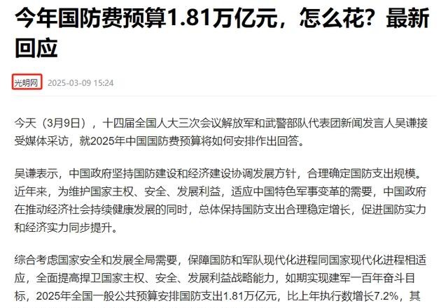 信源:光明网 2025年3月09日关于“今年国防费预算1.81万亿元,怎么花?最新回应”的报道
