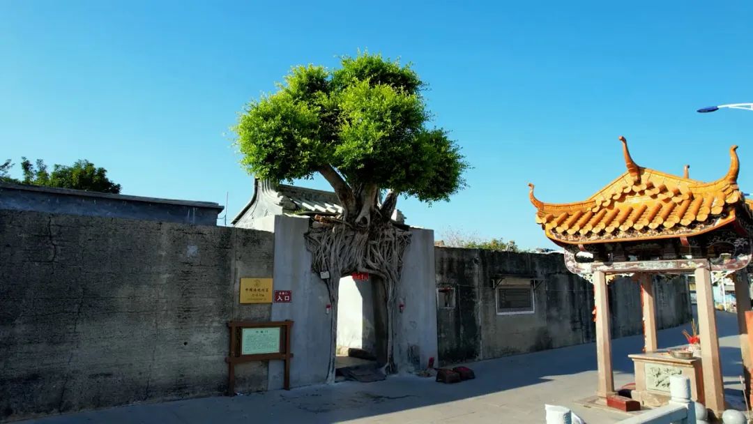 榕树的根系,如同精心雕琢的艺术品,错综复杂地缠绕在石门的每一个角落,有的甚至顽强地穿透石缝,深深扎入土壤之中,展现出生命最原始的力量与韧性。树冠郁郁葱葱,高约五米,冠幅更是达到了惊人的八米,古老而葱翠,每一片叶子都似乎在诉说着岁月的故事。