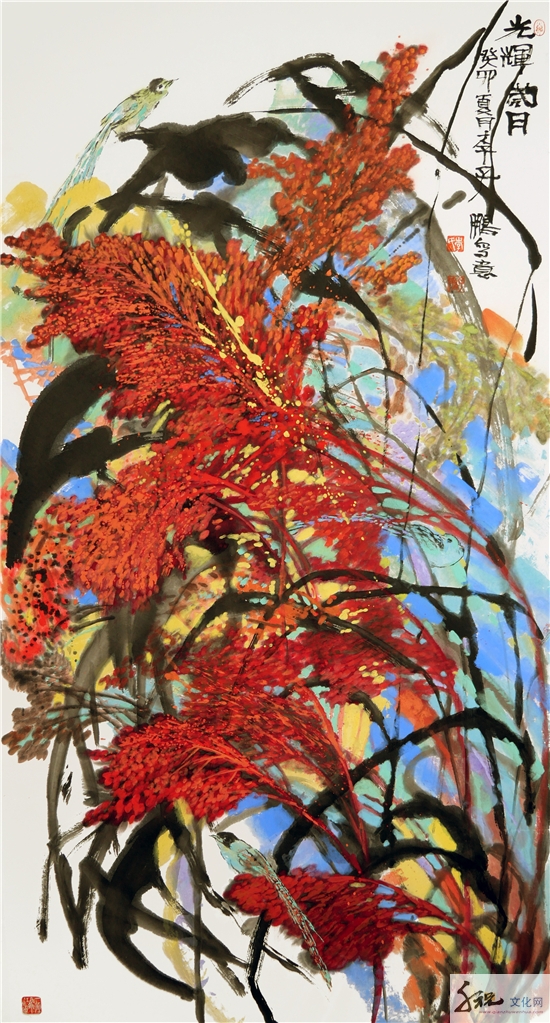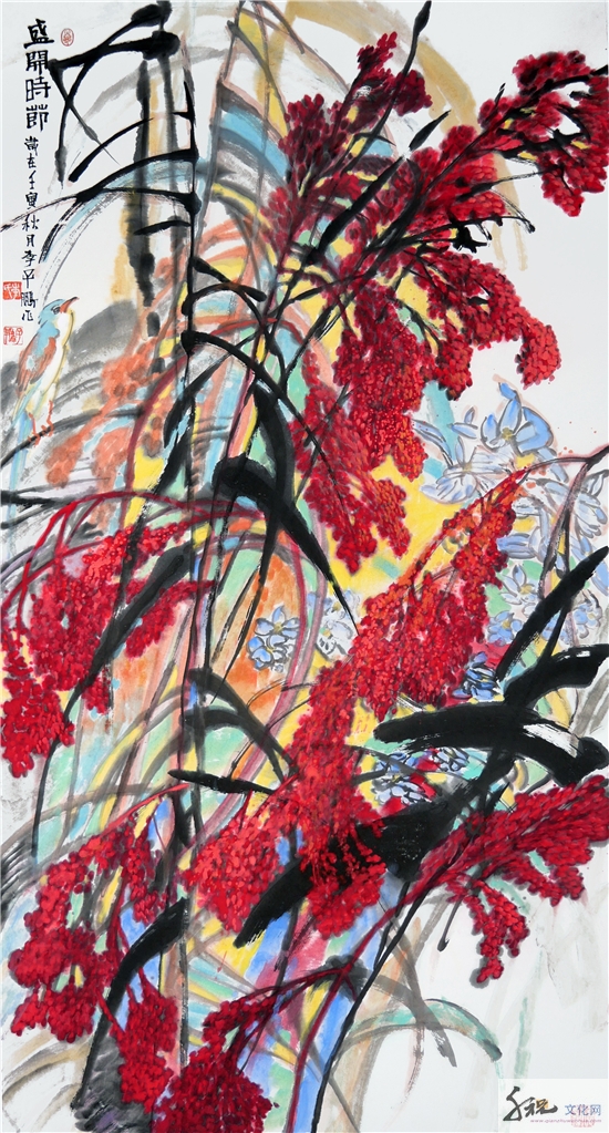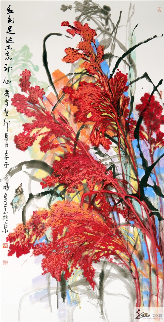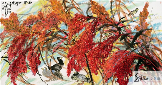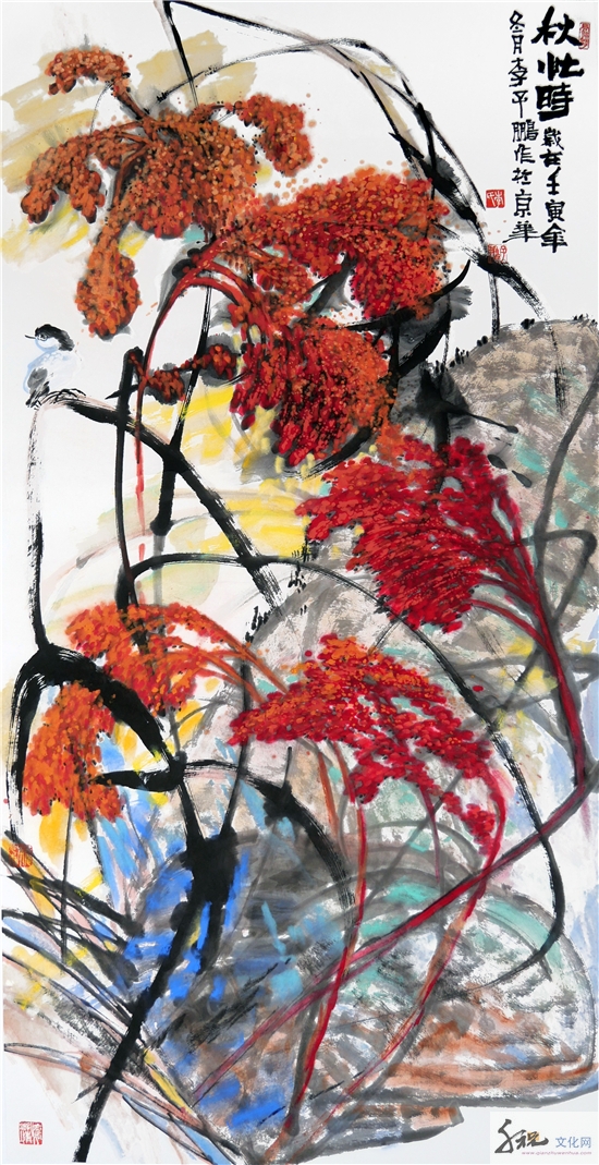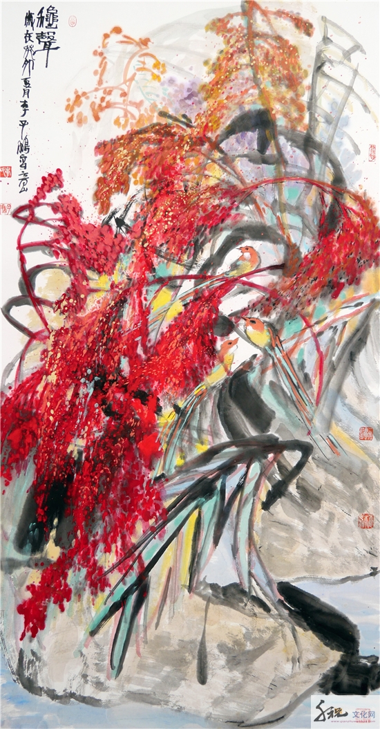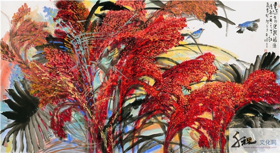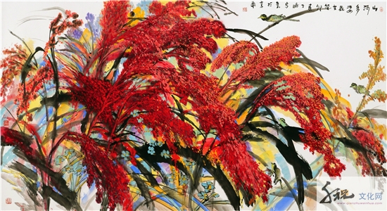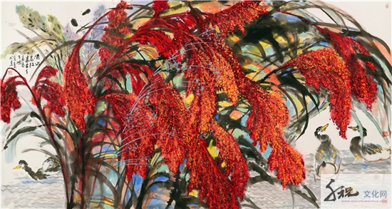 民以食为天,稻谷高粱是常见的农作物,而中华文明又是典型的农耕文明,也是传统文化的根基。李子鹏作为当代写意花鸟画的佼佼者,将“红高粱”这一中国花鸟画题材传承发扬,不仅拓宽了这一题材的表现内容,更以笔墨彰显出中国写意花鸟画的继承传统,开拓出新的精神。