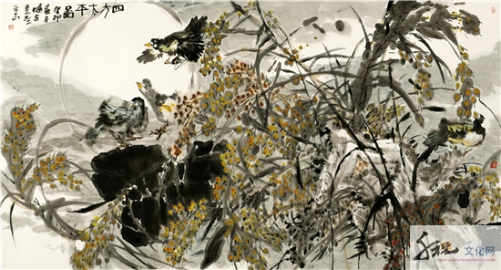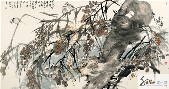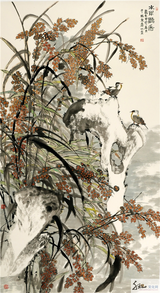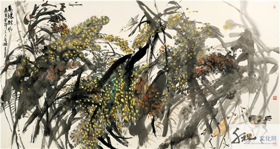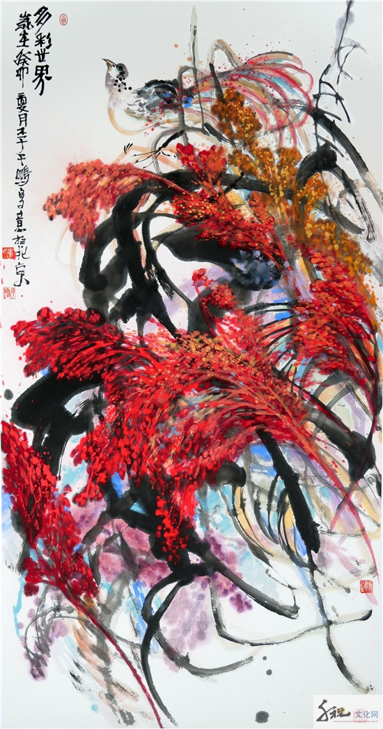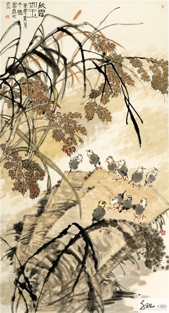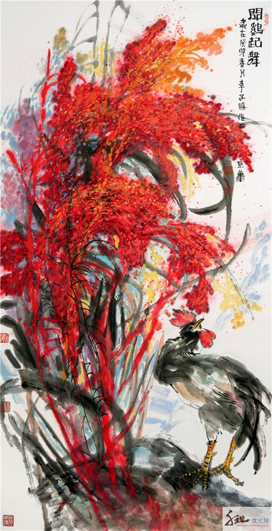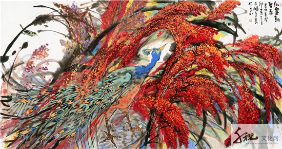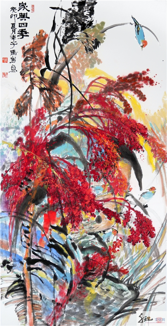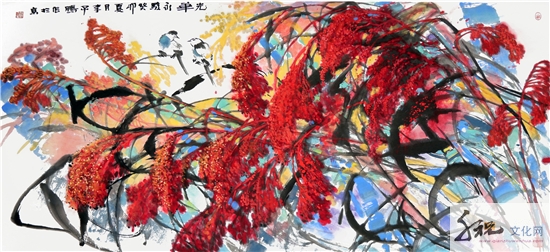 民以食为天,稻谷高粱是常见的农作物,而中华文明又是典型的农耕文明,也是传统文化的根基。李子鹏作为当代写意花鸟画的佼佼者,将“红高粱”这一中国花鸟画题材传承发扬,不仅拓宽了这一题材的表现内容,更以笔墨彰显出中国写意花鸟画的继承传统,开拓出新的精神。