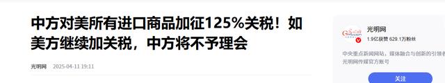 ( 信息来源:光明网 2025年04月11日 —— 中方对美所有进口商品加征125%关税!如美方继续加关税,中方将不予理会 )