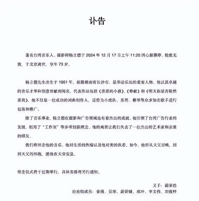 2024年12月7日,中国台湾著名音乐人杨立德因心脏骤停抢救无效,在北京去世,享年73岁。