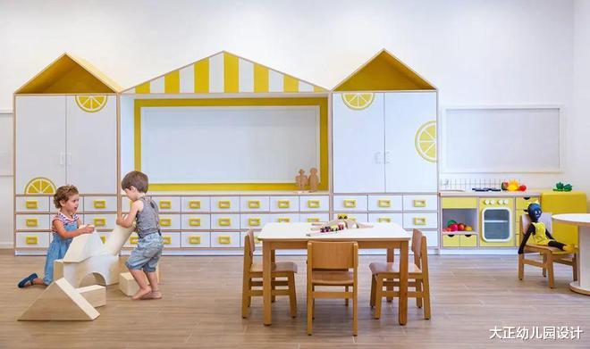 以柠檬为主题的幼儿园中,设置了阅读区、儿童角色扮演区和用于展示画作的磁性板。每个儿童都能够自由地选择充实自己或者体味游戏的乐趣。
