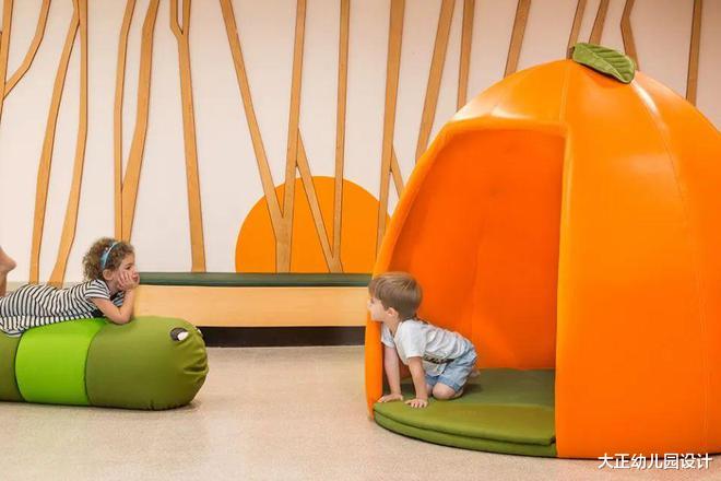 大厅中间也放置了不少橙皮小屋,小屋中铺设软垫,让幼儿园和过往行人能够获得一个舒适的休息和阅读空间。