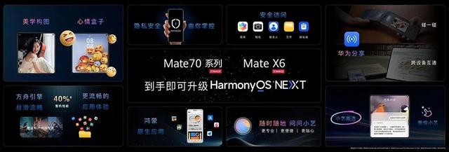 尽管发布会上并没有介绍SoC的参数,但余承东明确提到,这代产品是基于原生鸿蒙和软硬件协同的提升和突破。HarmonyOS NEXT是全栈自研与直抵内核的底层重构,具体优势和详情在此前发布会上已经提过,这里不在过多阐述。而运用到华为Mate 70系列则是实现了整机性能提升40%、39%的流畅度提升、游戏启动速度提升52%、平均帧率提升31%,再次强调,这是彻底摆脱安卓框架所迎带来的进步。同时HarmonyOS NEXT还有领先其他操作系统的一大特性,就是彻底打通了多设备、多场景服务和信息之间的自由流转,设备之间缝连接,文件传输、内容共享变得比安卓、iOS更加简单。