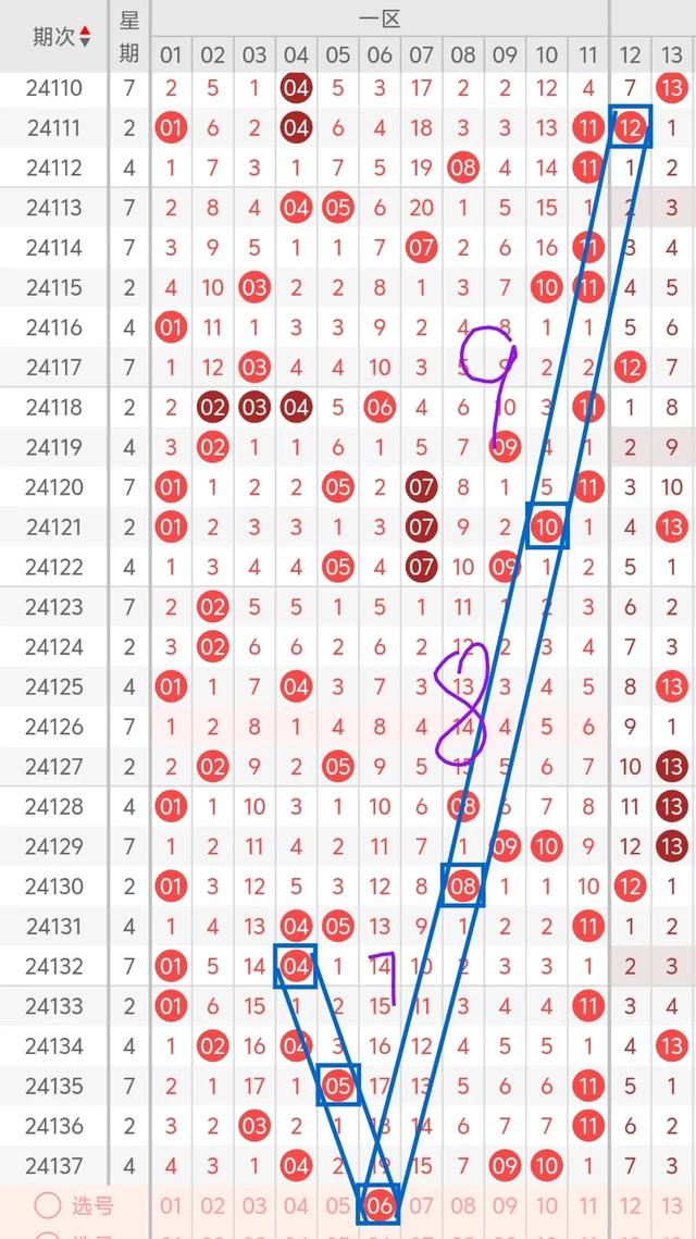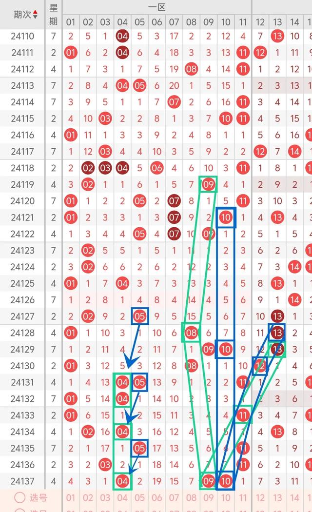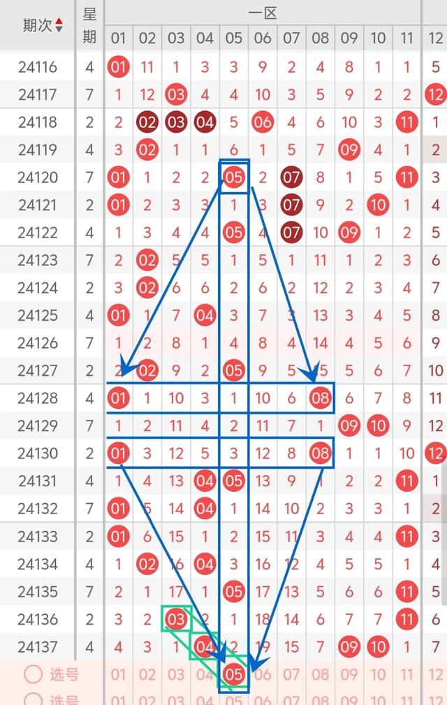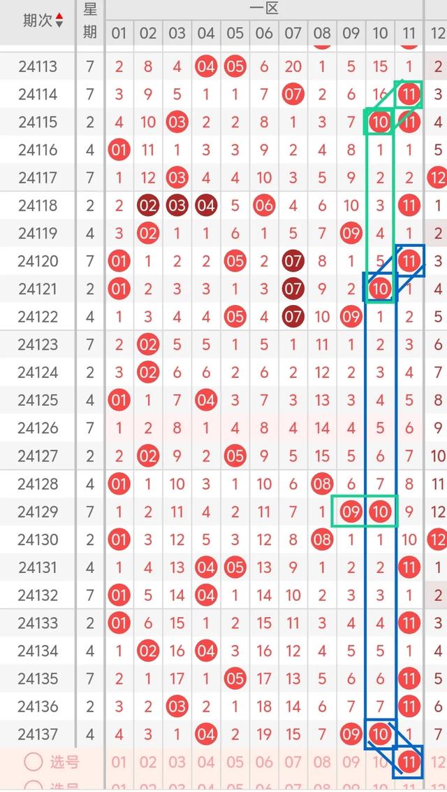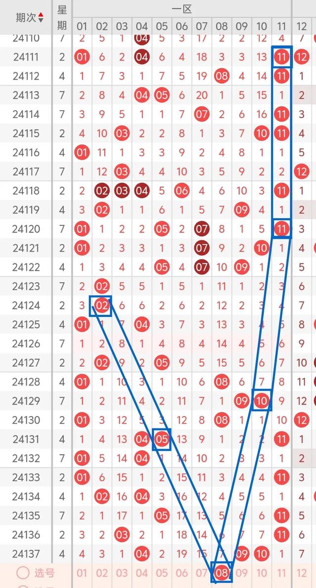 按以上走势规律图解分析01.02.04.06.07.08.10.11的概率比较高,最看好01.06.08.10.11