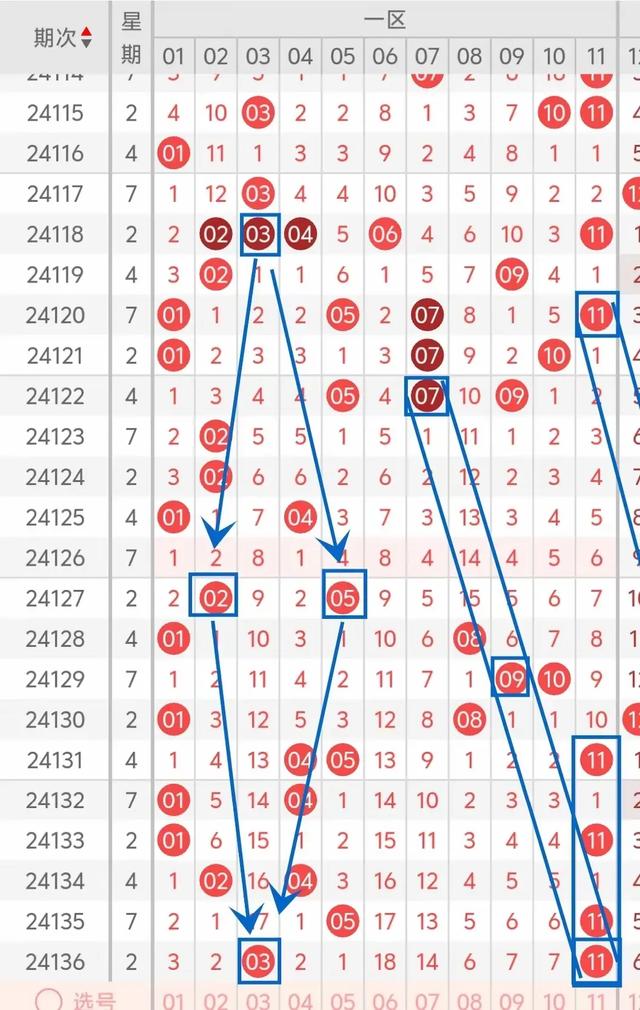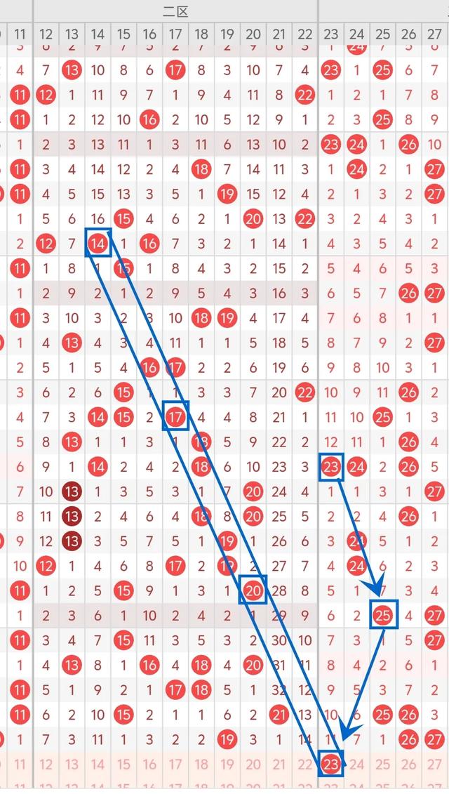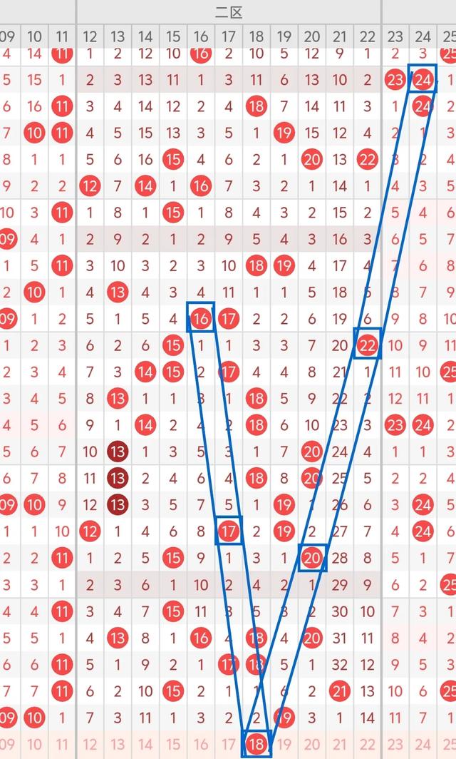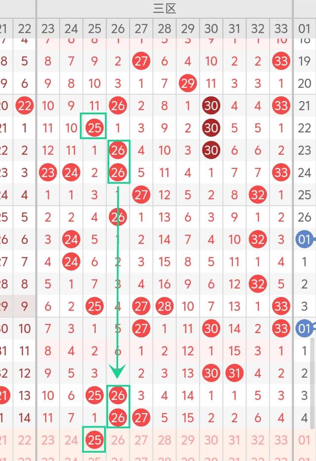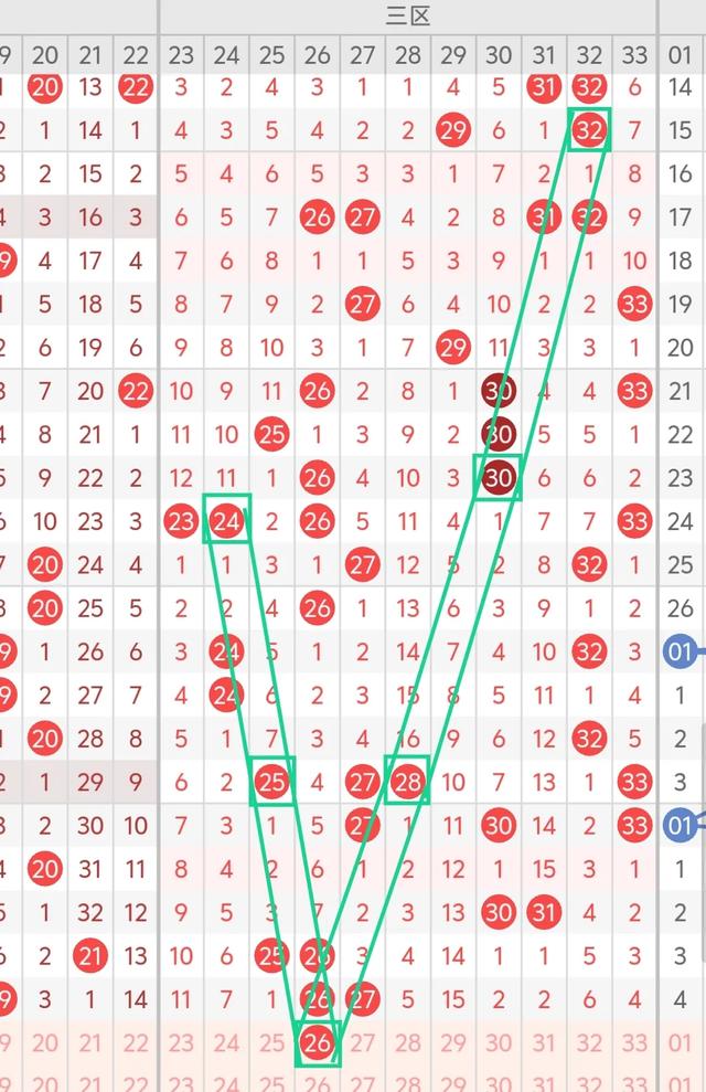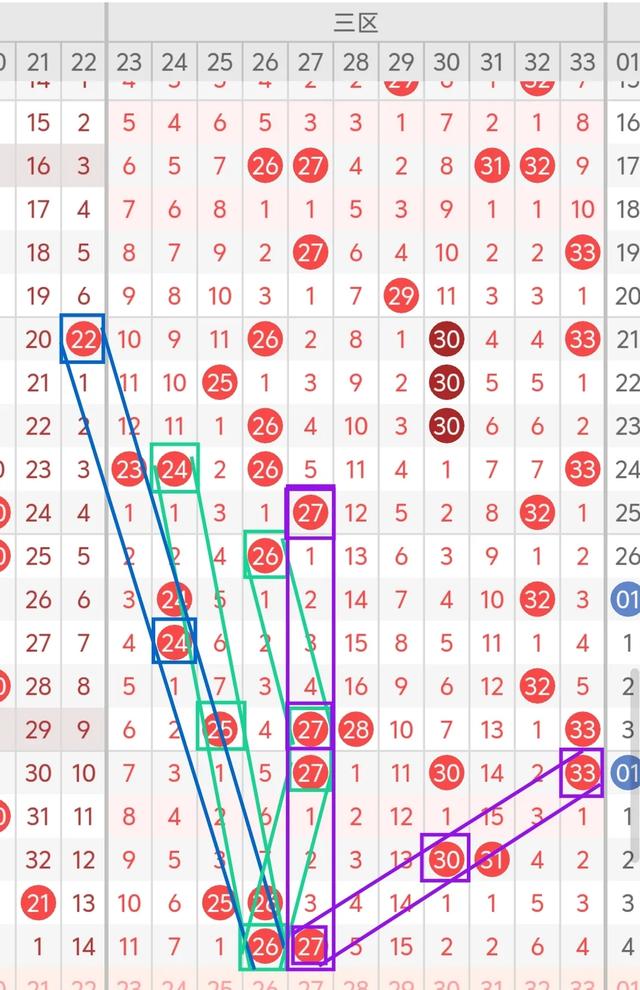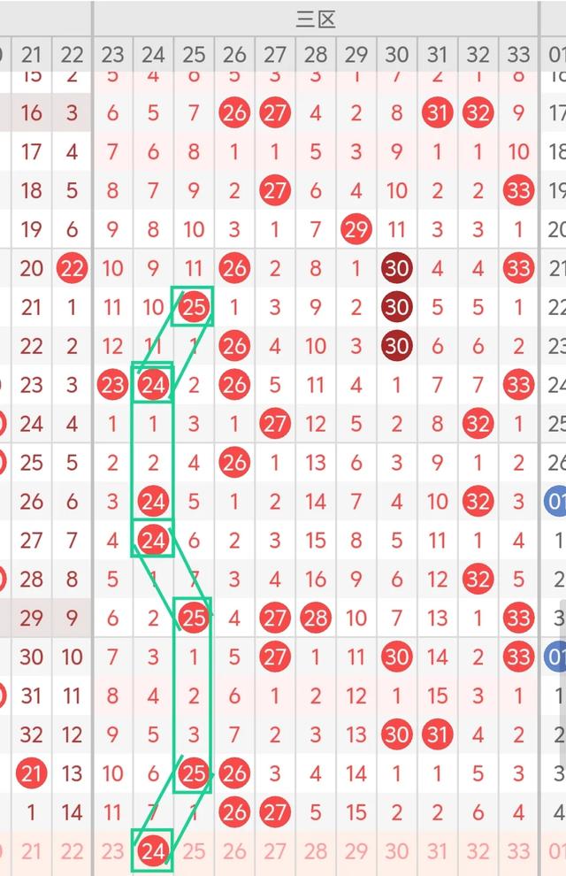 三区走势规律图解中比较看好:24.25.26.29.31.32.33