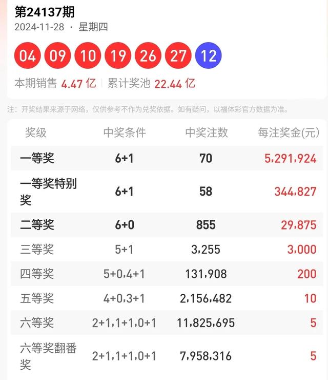井喷开出70注一等奖单注奖金5291924元,一等奖特别奖开出58注,奖金额外多得344827元。