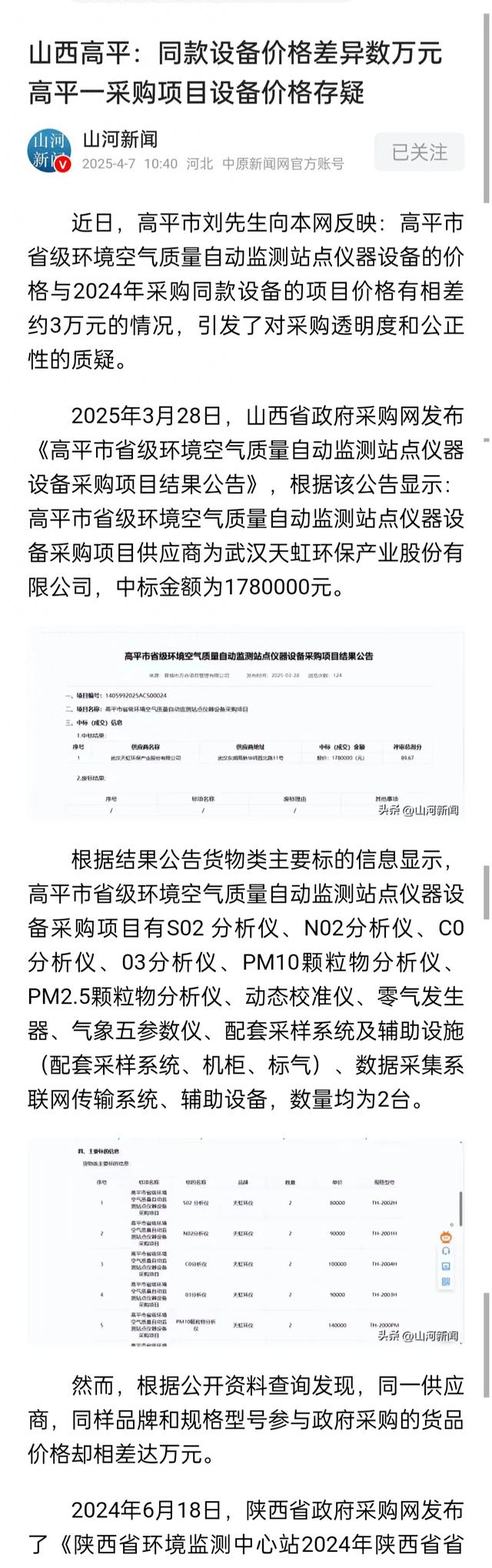 近日,高平市刘先生向本网反映:高平市省级环境空气质量自动监测站点仪器设备的价格与2024年采购同款设备的项目价格有相差约3万元的情况,引发了对采购透明度和公正性的质疑。