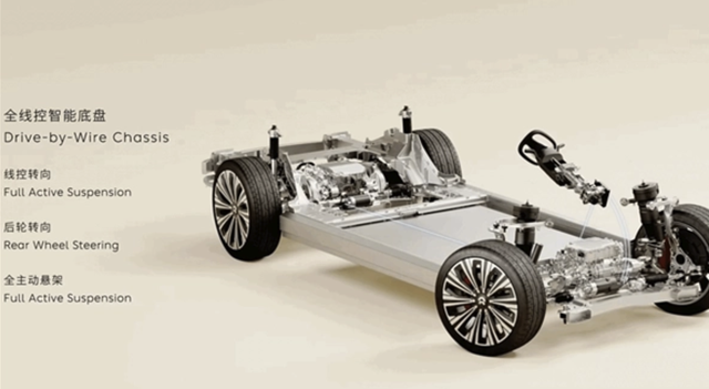 蔚来ET9还搭载了全球唯一的全线控智能底盘系统,集成了线控转向、后轮转向和全主动悬架三大核心硬件系统。这一底盘系统不仅使得车辆的方向盘与转向电机之间采用电讯号传输,结构重量更轻,还支持OTA升级。