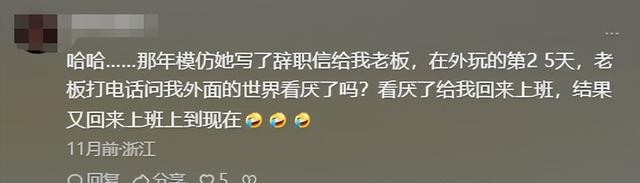 “哈哈……那年模仿她写了辞职信给我老板,在外玩的第2 5天,老板打电话问我外面的世界看厌了吗?看厌了给我回来上班,结果又回来上班上到现在。”