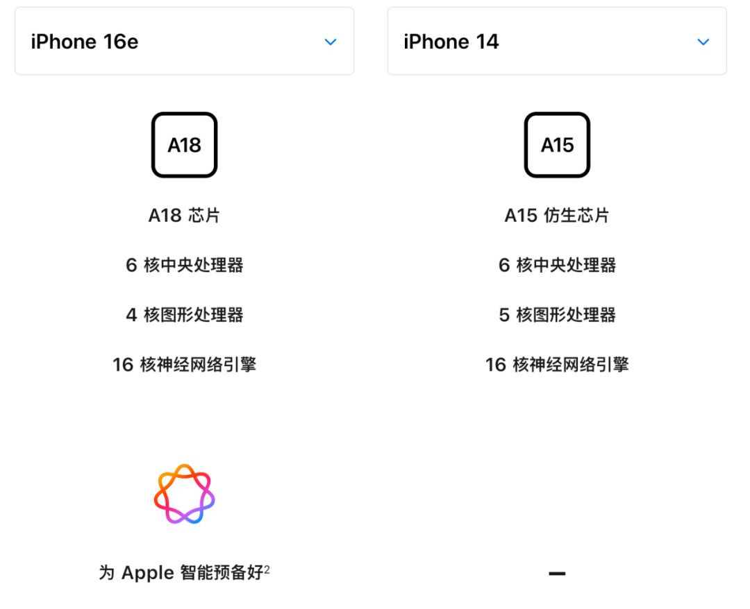配置上,iPhone 14 于 2022 年发布,搭载 A15 处理器 + 6GB运行内存的组合;而 iPhone 16e 升级为 A18 芯片+ 8GB 内存,性能领先三代,续航大幅提升,并且支持苹果 AI 功能,使用体验远超老旧的 iPhone 14。