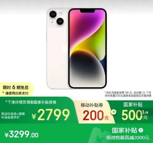 想要以最低价拿下iPhone 14 标准版,还需要绑定中国移动一年合约,每月保底消费为 59 元。也就是说,不仅要使用一年的中国移动手机卡,还需支出共计 708 元的保底消费。