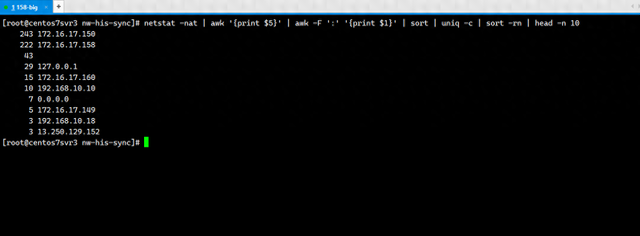 1、查看服务器 top10 连接客户端的 IP 地址netstat -nat | awk '{print $5}' | awk -F ':' '{print $1}' | sort | uniq -c | sort -rn | head -n 10