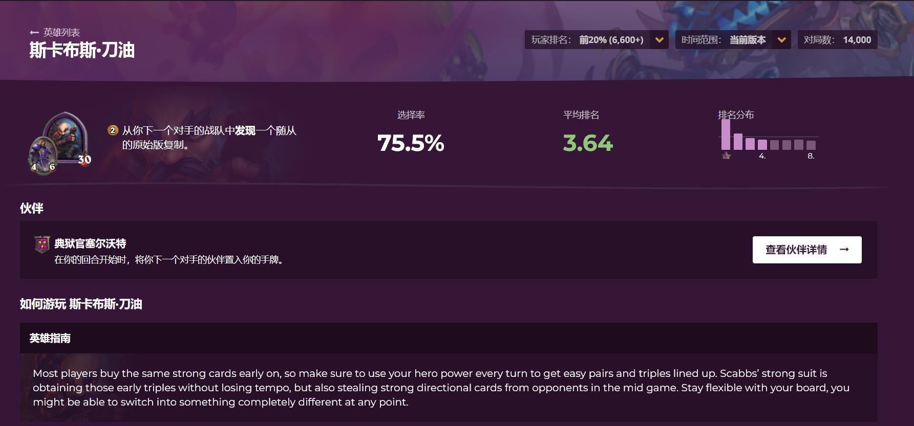 在目前的伙伴版本里,T1英雄当属斯卡布斯·刀油,在新版本刚上线的时候,刀油的吃鸡率高达35%,可以说是史上吃鸡率最高的英雄了,因而在一次热修中直接将刀油的护甲削成了5点,但从目前的大数据来看,如果不是数据延迟的话,护甲的削弱似乎对刀油的影响并不大,目前吃鸡率依然高的离谱,整体排名也是遥遥领先。