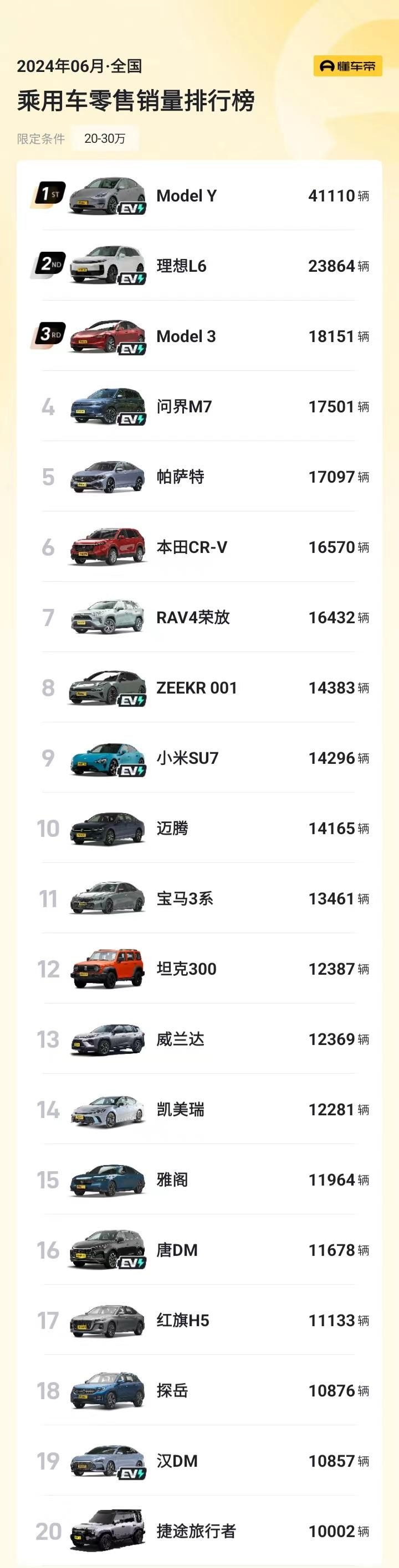 2024年6月,国内20至30万元价格区间的乘用车市场迎来了蓬勃发展。随着消费者对高品质和高性能车辆需求的不断增加,该价格区间的车型销量表现尤为亮眼。新能源车型在该市场中的占比进一步提升,显示出消费者对环保和节能的重视。
