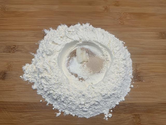 1,面粉可以放盆里揉,也可以跟我这样摊开在砧板上揉,中间开个窝,来点白砂糖促进发酵,来少许酵母粉,猪油增白,然后加入清水,边倒边搅拌,搅成面絮状。