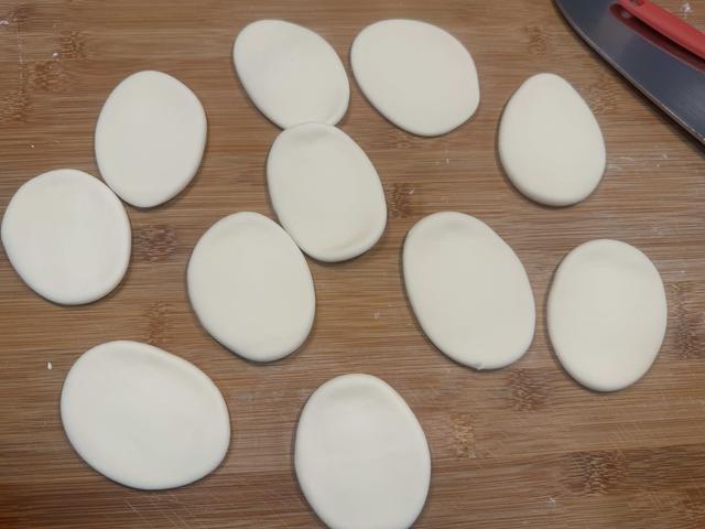 3,分别把每个面剂子揉成圆球状,再用擀面杖擀开,随意擀成椭圆形即可,不需要什么技巧。