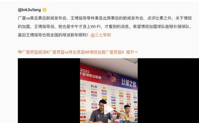 CBA常规赛浙江广厦103-89击败青岛,继续稳居积分榜第一!而排名第1的广厦没有停下脚步,他们签下新外援博班,广厦主帅王博赛后亲自确认这个消息,强调博班加盟是一个好的补强。
