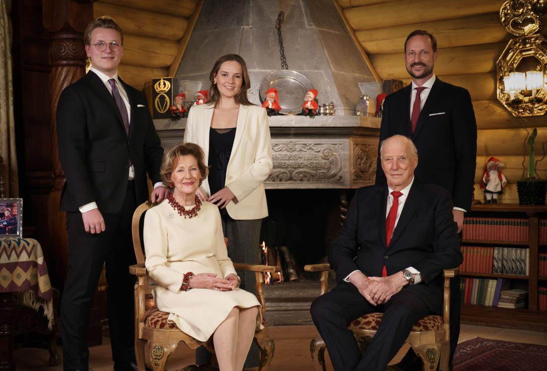 挪威王室官方发布今年的圣诞节官方照,梅特因为感染新冠缺席拍摄;挪威王后穿着一件小白裙,佩戴时髦的项链,脚踩一双红色皮鞋,一身职业裙装尽显成熟女性的优雅美。