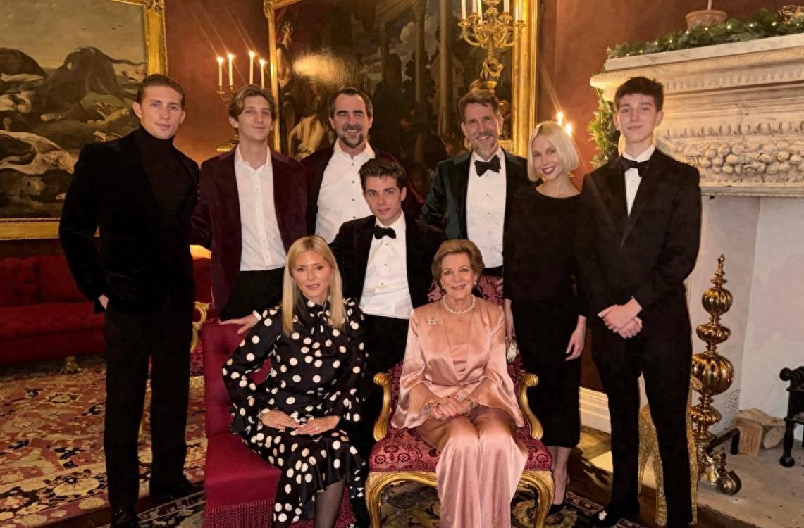 希腊王室发布圣诞节合影比较晚,安妮-玛丽王后穿粉色套装坐在椅子上,彰显雍容华贵之美还不失贵气,毕竟是王室贵女身份,即使老了也照样美,另外是王储一家七口,还有尼古拉斯王子。