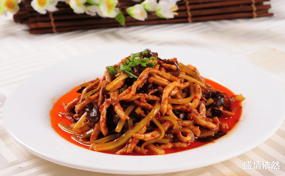 收汁出锅:汤汁浓稠后加入肉丝、葱段,快速翻炒均匀即可。