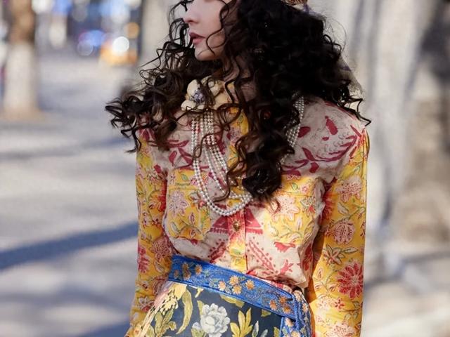 她一头大波浪卷发配上色彩斑斓的头巾,复古又摩登,展现了与众不同的女性韵味。
