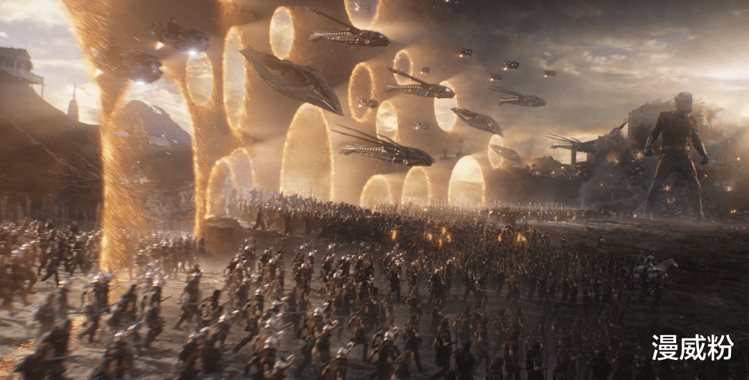其中一个经典的场景:所有超级英雄通过魔法传送门的方式集体登场。