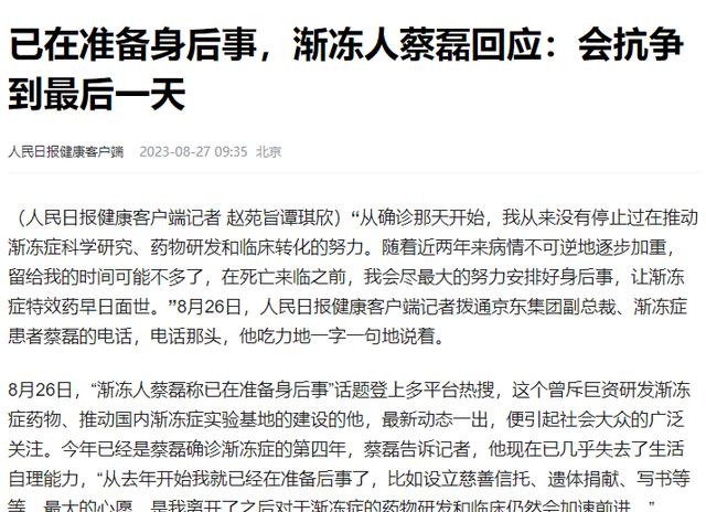 人民日报健康客户端2023-08-27已在准备身后事,渐冻人蔡磊回应:会抗争到最后一天