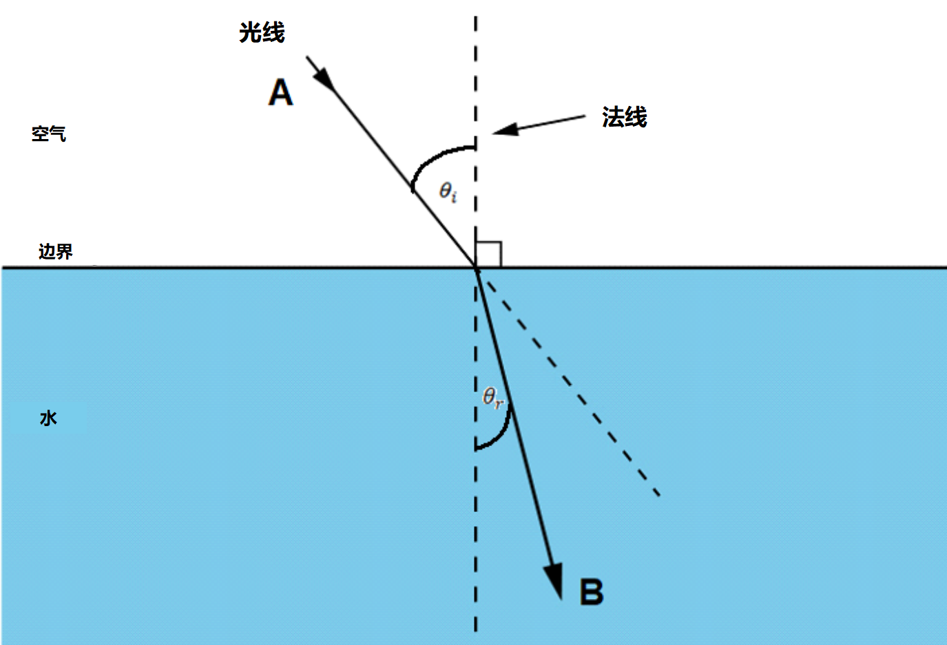 考虑一束光从A点出发,穿过水面到达B点。这束光的路径是怎样的?我们可以假设它沿直线运动以使距离最小化。然而,在现实中,光线并不是这样传播的。相反,它在空气和水的边界处被折射。