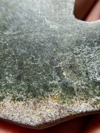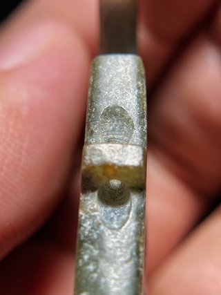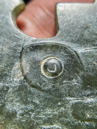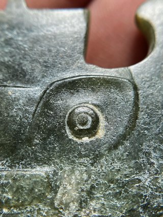 明以前 青玉 神人兽面纹 玉佩 挂件 长6 宽3 厚0.3 重26.8克 玉质青色,半透明,细腻温润,局部钙化灰白沁色。器呈对称扇形,上端打孔,可作穿绳佩戴,浮雕兽面纹,兽面重圈为眼,用减地浅浮雕形成宽鼻,眼外有椭圆形眼睑,眼睑之间有桥形梁相连,为典型的良渚文化图腾,神人兽面纹。