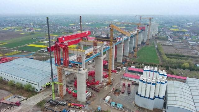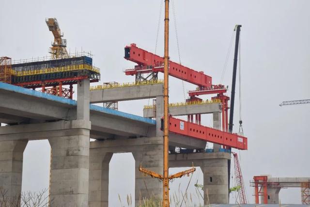 主梁吊装是安装移动模架最为重要的一步,后续还需联系梁、导梁、外肋、模板施工等。预压完成后,才能进行桥梁浇筑。崇启公铁长江大桥北引桥公路侧移动模架全长91.4m,重约1200吨,此次吊装的主梁单个重约120吨,负责主桥6号墩至引桥12号墩左右幅24孔上层公路现浇梁施工,计划在今年4月底完成预压。