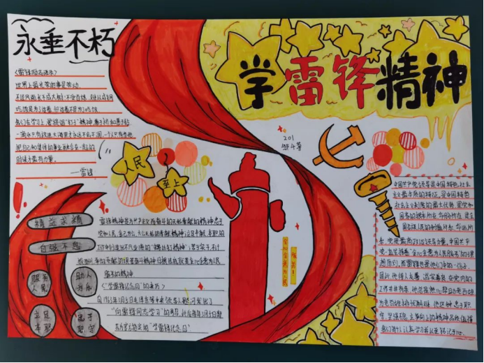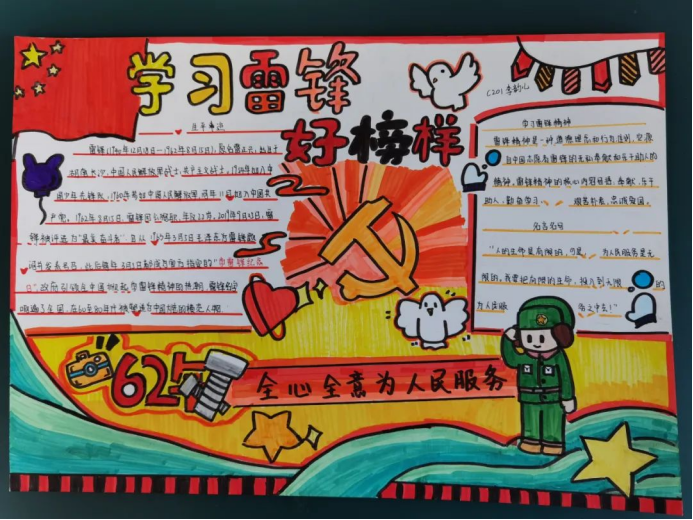 可爱的同学们利用课余时间,精心搜集资料,用心设计版面,用五彩的画笔描绘出心中的雷锋形象,用真挚的语言表达对雷锋精神的感悟。让我们一起来欣赏一下同学们的精彩作品吧!