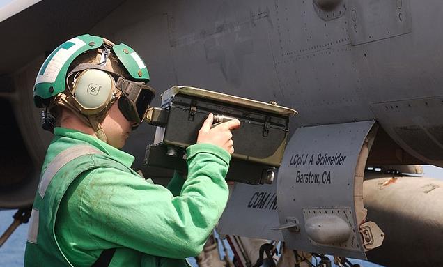 ■美军海军地勤人员正在调试F/A-18战斗机上的敌我识别应答机。