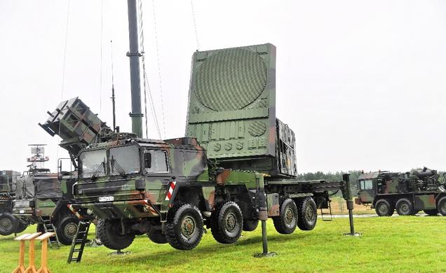 ■美制“爱国者”防空系统的搜索雷达,背景中可见导弹发射器。