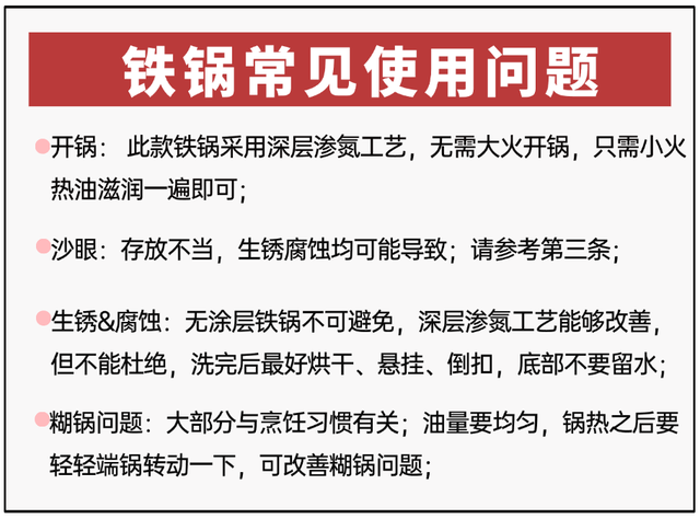 1.本场一件包邮,没有运费险, 部分地区不发货;部分地区不包邮,以实际为准; 收到请及时检查,质量问题或缺货少货48小时内携快递面单联系客服;不影响二次销售可7天无理由退货; 2.各产品售后请参考详情页;锅是耐用品,使用不当会缩短其寿命年限,请按照详情页提 供方式养护,人为致损不享受退换售后; 3.双十一到了,各地快递可能会爆仓,出现物流延迟现象,特别急用慎拍; 正文 铁锅 终于 上 新了 定制不易 多啰嗦几句 说下为什么会走定制模式 刚需品&市场缺口大 但市面上产品却鱼龙混杂 价格虽低却无法保证品质 品质好又控价 很难做到既好用又实惠 定制的话更自主 八月份去永康 接 触了很多工厂 也了解到许多 行业内幕 回收料、 隐蔽涂层、氮化工艺不够等 市场通货往往有这样那样的问题 现货便宜但 也容易踩坑 了解后决定按照品牌高配做定制 从选材料到细节打磨 花了2个多月才敲定最终版 唯独就是款比较单一 因为 工厂有≥500口的起订标准 首次合作只能选常见的32cm口径深层渗氮 耐腐防锈性能更好