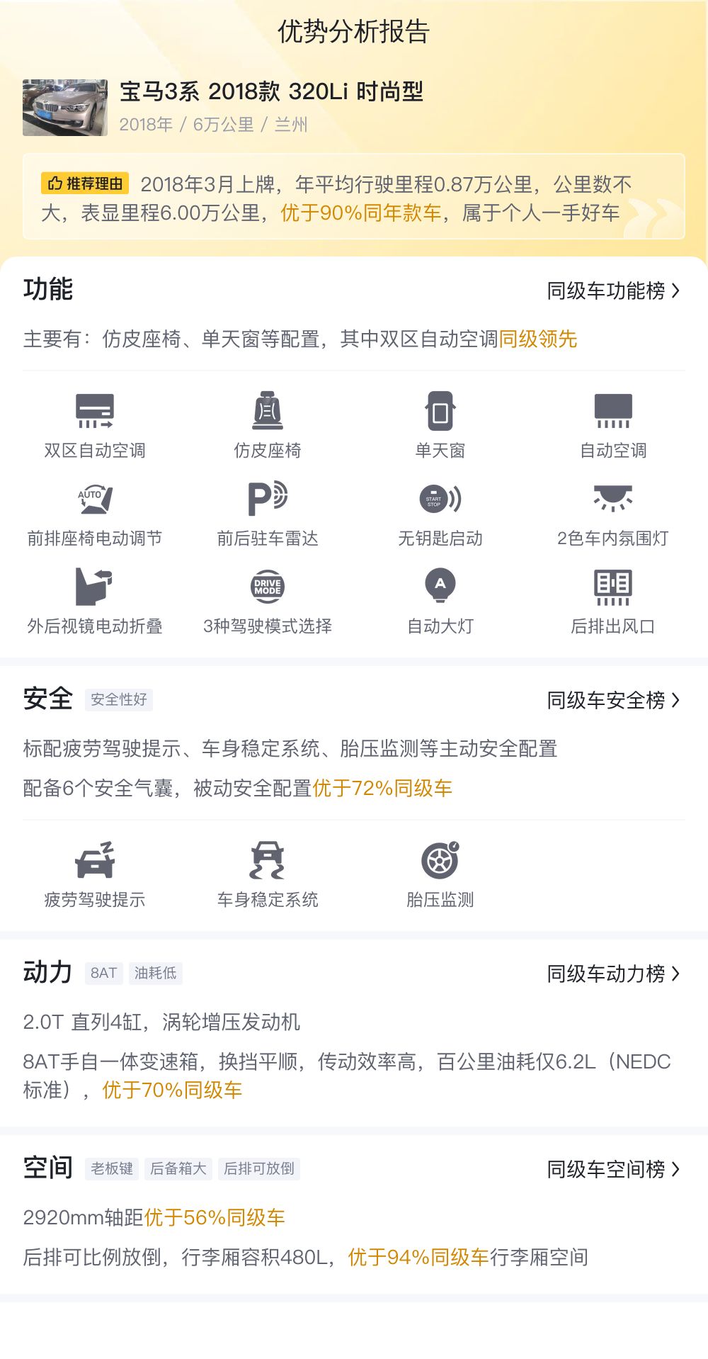 这辆二手宝马3系的具体版本是——宝马3系 2018款 320Li 时尚型,首次上牌时间为2018年3月,上牌地为兰州,表显里程6万公里,车身颜色为香槟色,新车指导价32.38万,二手车报价13.48万,未过户。