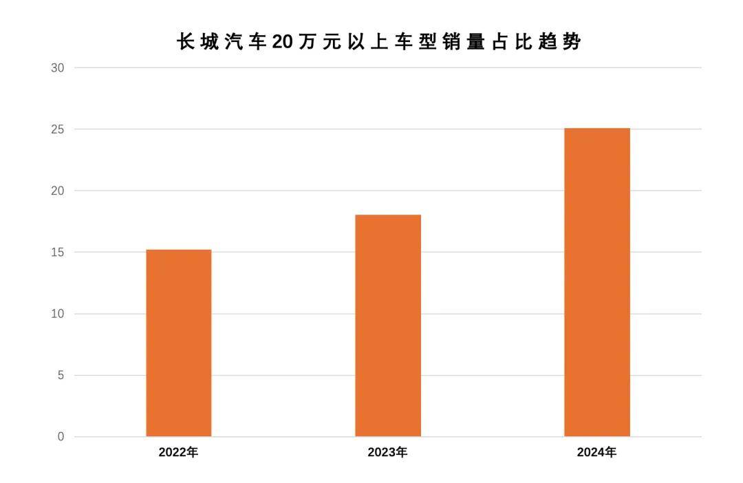 2024年,长城汽车20万元以上车型销售30.9万辆,占总销量的25.1%,也就是 说,每卖出四台车,就有一台是20万元以上的车型。