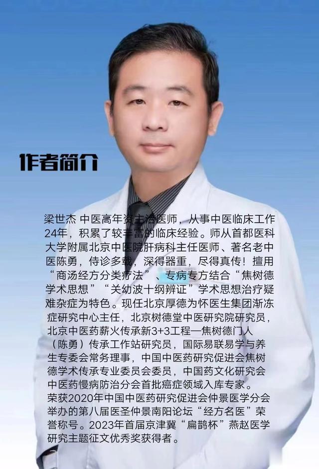 作者简介:梁世杰 中医高年资主治医师,从事中医临床工作24年,积累了较丰富的临床经验。师从首都医科大学附属北京中医院肝病科主任医师、著名老中医陈勇,侍诊多载,深得器重,尽得真传!擅用“商汤经方分类疗法”、专病专方结合“焦树德学术思想”“关幼波十纲辨证”学术思想治疗疑难杂症为特色。现任北京厚德为怀医生集团渐冻症研究中心主任,北京树德堂中医研究院研究员,北京中医药薪火传承新3+3工程—焦树德门人(陈勇)传承工作站研究员,国际易联易学与养生专委会常务理事,中国中医药研究促进会焦树德学术传承专业委员会委员,中国药文化研究会中医药慢病防治分会首批癌症领域入库专家。荣获2020年中国中医药研究促进会仲景医学分会举办的第八届医圣仲景南阳论坛“经方名医”荣誉称号。2023年首届京津冀“扁鹊杯”燕赵医学研究主题征文优秀奖获得者。