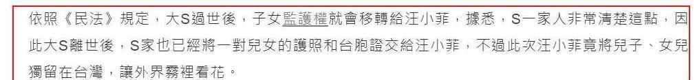 大S在世时,为了孩子的抚养权问题,多次与前夫在法庭上对峙。她离世之后,孩子的抚养权归男方所有。当前,汪小菲已经取得孩子的台胞证,返回北京为孩子办理相关手续。待一切安排妥当,便会彻底将两个孩子接回北京。至此,和S家之间的恩恩怨怨也能够画上句号。
