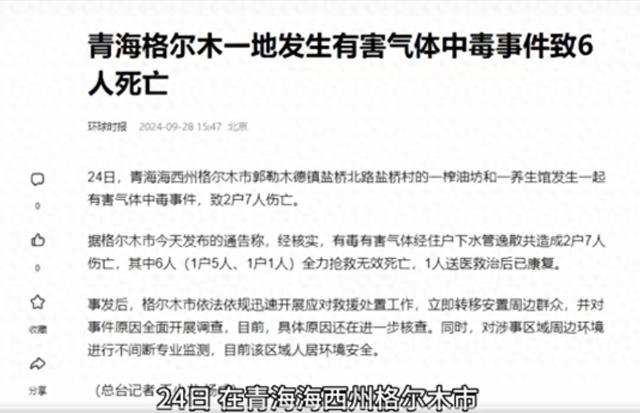 9 月 24 日的夜晚,如墨的黑暗笼罩着青海省海西州格尔木市盐桥村,一场突如其来的灾难——下水道毒气泄漏事故,犹如恶魔张开了狰狞的大口,无情地吞噬了 6 条鲜活的生命。这一事件犹如巨石投入湖中,在社会各界激起了轩然大波。
