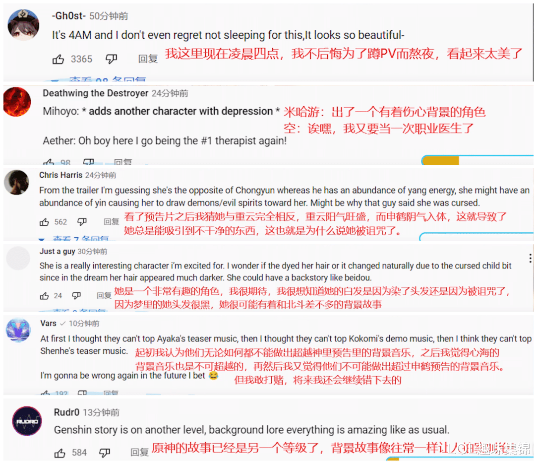 同样,申鹤的PV在国外也火了起来,根据PV的内容,老外们纷纷对申鹤的背景作出了猜测,虽然说的天花乱坠,但好像还真有几分道理。并且大部分玩家也给出了,申鹤太美了、背景音乐好听、剧情超赞等评论。