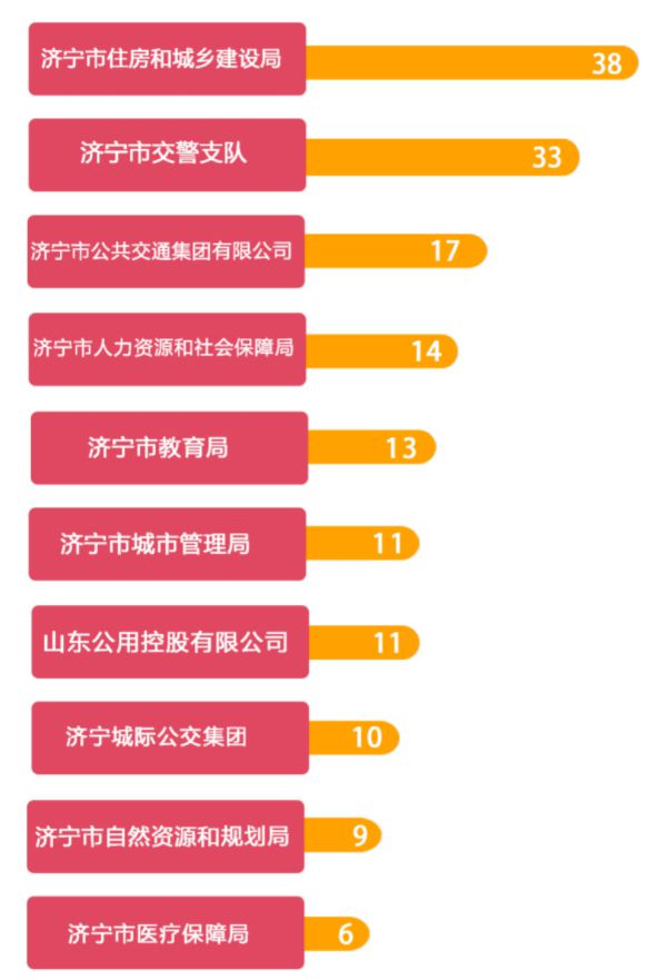 本期(2024年6月17日-6月30日),济宁市共受理1032件。其中市直部门、单位受理239件,量最多的是济宁市住房和城乡建设局,38件,占市直部门、单位总量的15.8%;其次是济宁市交警支队,33件,占13.8%;第三是济宁市公共交通集团有限公司,17件,占7.1%。具体情况如下图示: