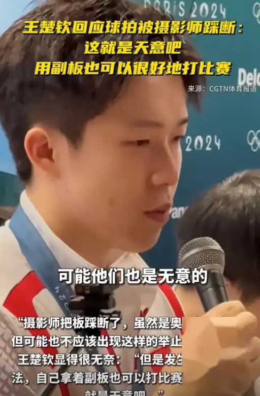 但这次奥运会的男单比赛中却出现了意外,因球拍问题王楚钦遗憾出局,具体情况他并没有透露太多,在赛后接受采访时王楚钦也显得十分沉默和失落。