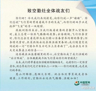 信中文字洋溢着热情、喜悦、鼓励,表达着真挚的感谢和共同战斗的决心。近年来,在辽宁舰不同部门、不同岗位舰员的可靠托举下,一批又一批舰载机飞行员奋力提高训练效益,战斗力生成周期不断缩短。