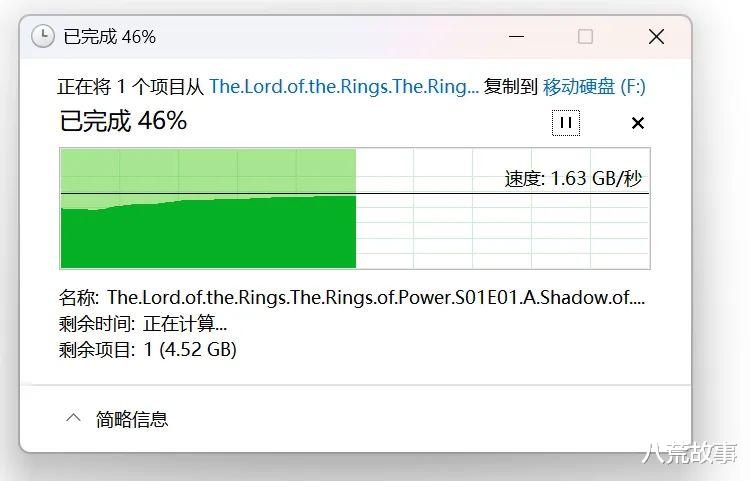继续看实际文件传输表现。将一部40GB左右的4K电影从电脑拷贝到阿卡西斯TBU405ProM1上,实时传输速度在1.5GB/s以上,这样一部电影传输完成只需要20多秒,还是挺快的。