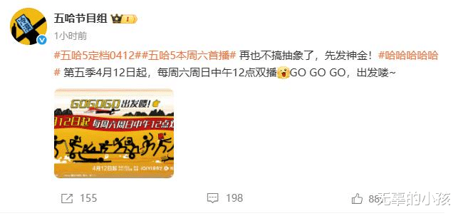 2025年4月10日,犹如春日里的一声惊雷,备受亿万观众瞩目的国民级综艺节目《哈哈哈哈哈——很高兴遇到你》第五季,在万众瞩目中正式宣布了它的璀璨登场。节目组通过其官方认证的微博账号“五哈节目组”,以一纸满载喜悦与期待的宣言,向全世界宣告:本季节目将于4月12日起,在每周六与周日的正午阳光下,即中午12点,以双播的形式,与观众不见不散。这则消息犹如春风拂面,瞬间点燃了粉丝们积蓄已久的热情,评论区瞬间被“快乐回来了!”的欢呼声所淹没,字里行间洋溢着难以言喻的激动与期盼。