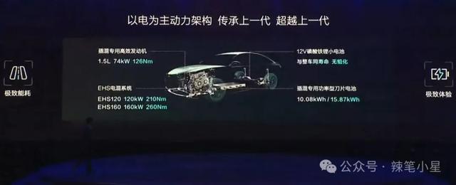 搭载新一代插混专用发动机峰值功率达到74kW,配合EHS电混系统(120kW和160kW的峰值功率版本)实现了卓越的燃油经济性。全新的插混专用刀片电池提供了10.08kWh和15.87kWh两款电量选择,适配不同用户的里程需求。12V磷酸铁锂小电池作为插混标配,保证了与整车同寿命的长效使用,且无需担心亏电问题,"只要车上有油,就永远有电",这不仅体现了比亚迪对整车同寿命的坚守,也大大降低了用户的使用成本。