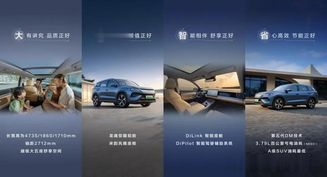 第二代宋 Pro DM-i 还提供了16项核心标配,包括插混专用1.5L高效发动机、EHS电混系统、插混专用功率型刀片电池等,为用户带来了高价值的用车体验。车载ETC、手机NFC车钥匙、VTOL移动电站功能等配置进一步提升了车辆的实用性和便利性。