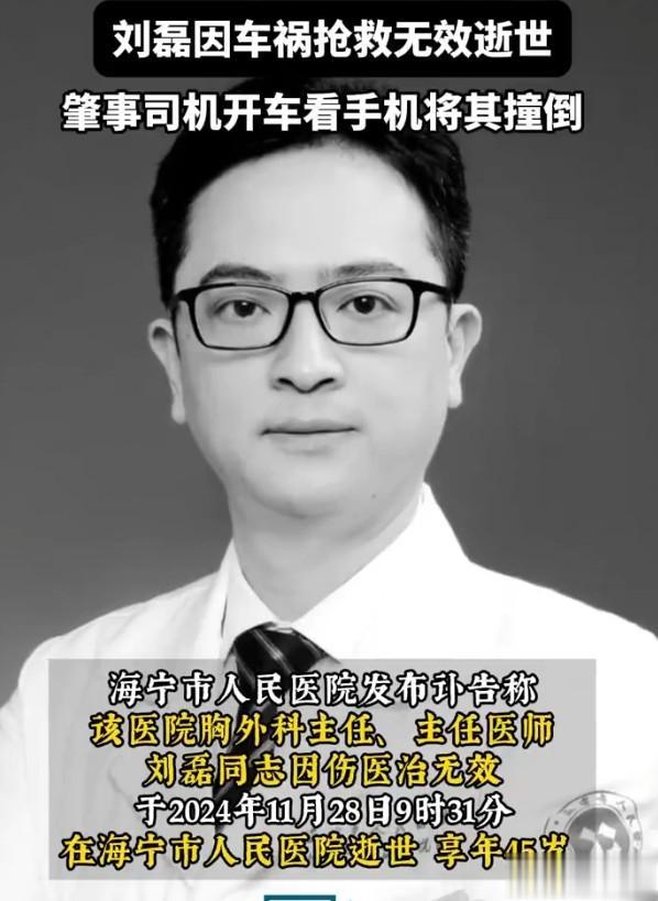 11月28日,浙江海宁市人民医院胸外科主任刘磊医生,被一个开车看手机的司机撞倒,不幸去世了,年仅45岁。这消息一出来,我心里堵得慌,相信大家也一样。